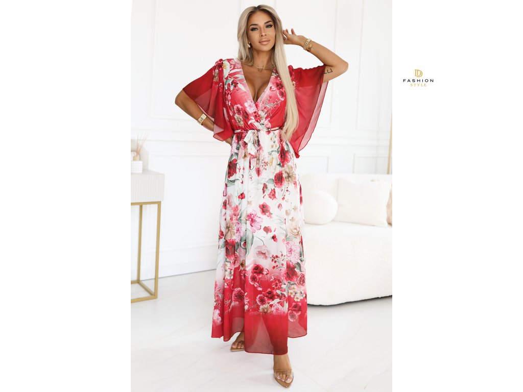 Vzdušné maxi šaty s kopertovým výstřihem, širokými rukávy a květinovým vzorem – červené růže