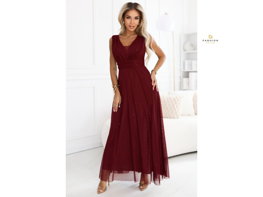 Dlouhé večerní šaty s brokátovým akcentem a hlubokým výstřihem - vínové