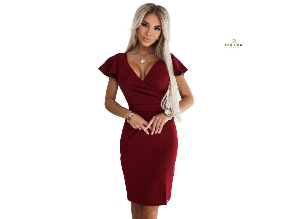NINA elegantní šaty s psaníčkovým výstřihem, rukávy a páskem - vínová barva