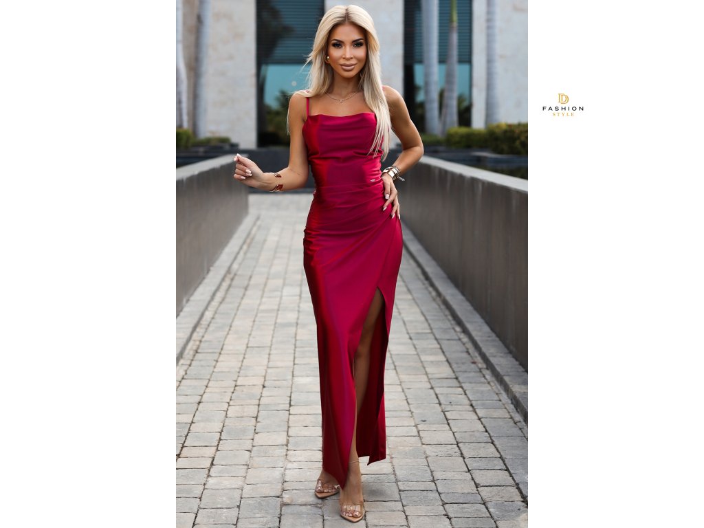 Diane - dlouhé saténové šaty s rozparkem na nohavicích a přehozením na boku. Barva: malinová. Šaty krásně zvýrazní pas. Zapínání vzadu na krytý zip. Polský výrobek. Značka numoco.