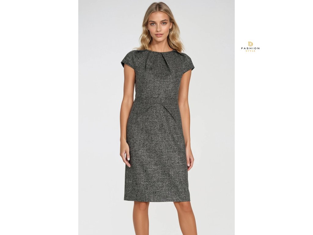 Elegantní dámské šaty ve střihu přiléhavém (fit), vyrobené z materiálu s melírovanou strukturou a nepravidelnou barvou, která jim dodává moderní charakter. Model má kulatý výstřih a rukávy typu cap, jemně zakrývající ramena. Délka po kolena a olověná spodní část zdůrazňují postavu, dodávají šatům klasický a elegantní střih. Šaty se zapínají vzadu na zip a výstřihu a v pase jsou ozdobné záložky, které celku dodávají jedinečný šarm. Ideální na formální události i večerní styling.